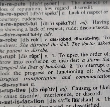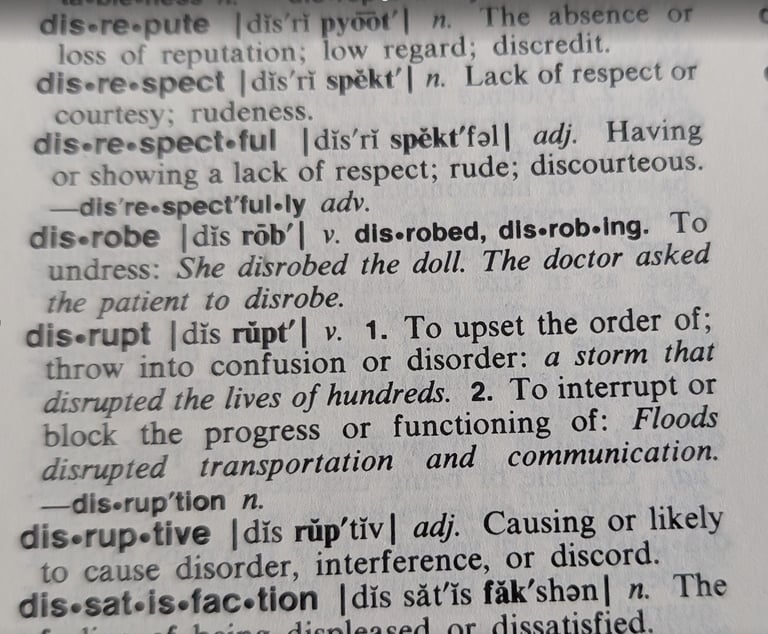 Recently, I was dusting my home office bookshelves and stumbled across a grade school edition of “My American Heritage Student’s Dictionary” with a copyright from 1986. As a GenX kid from the 1980’s, I am always amazed at the privilege of having a handheld computer in my back pocket because I can appreciate the effort it took as a child to quench my curiosity for learning. Sometimes, I find amusement in comparing the online Oxford Languages modern definitions to my printed, “vintage” reference books. For example, it is interesting how a common word like “disrupt” has evolved in the last four decades.