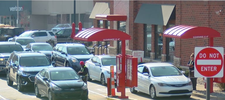 Chick-Fil-A offers multiple drive-thru lanes during peak hours of demand. And much like the middle school process, there is one-way entry and exit for drive-thru guiding cars into lanes using barriers. Even though each lane may have six cars in front, the queue kicks off much earlier than Indi’s because Chick-Fil-A staff are mobile with flexibility to move backwards (as necessary) in the line to start orders early and process payment using handheld devices. This enables the staff adequate time to prepare orders, which are generally waiting as soon as the customer pulls up to the window to pick up their packaged food order. This is a common experience but there are exceptions. My husband and I once grabbed Chick-Fil-A in a Southern Indiana drive-thru because we were short on time. Their handheld payment processing devices were not operable. Despite having an ability to take the order, payment processing was deferred to the pick-up window, which added time…and it took three times longer than we were accustomed to waiting in line for drive-thru leading to frustration since the experience caused us to be late for an appointment.